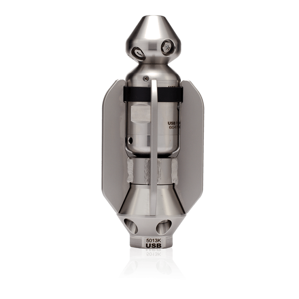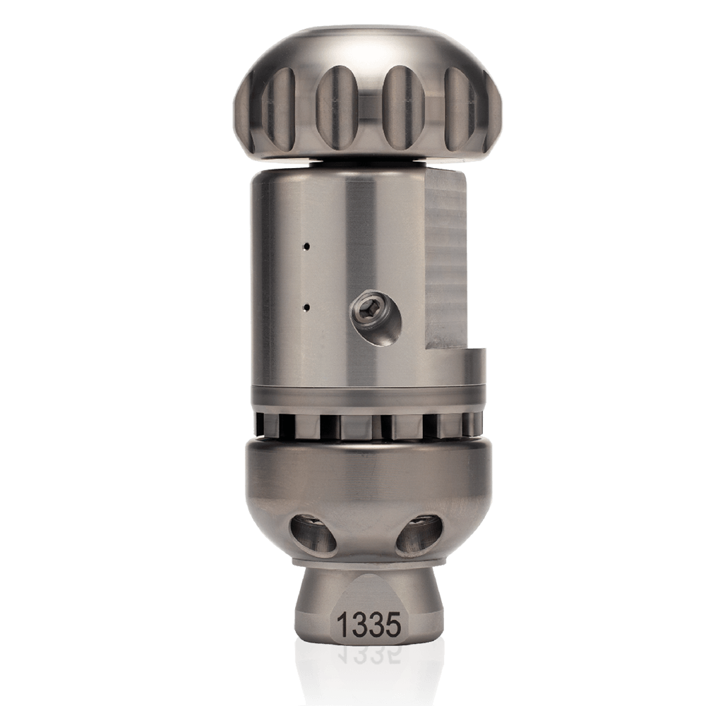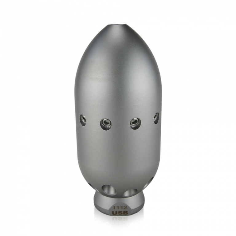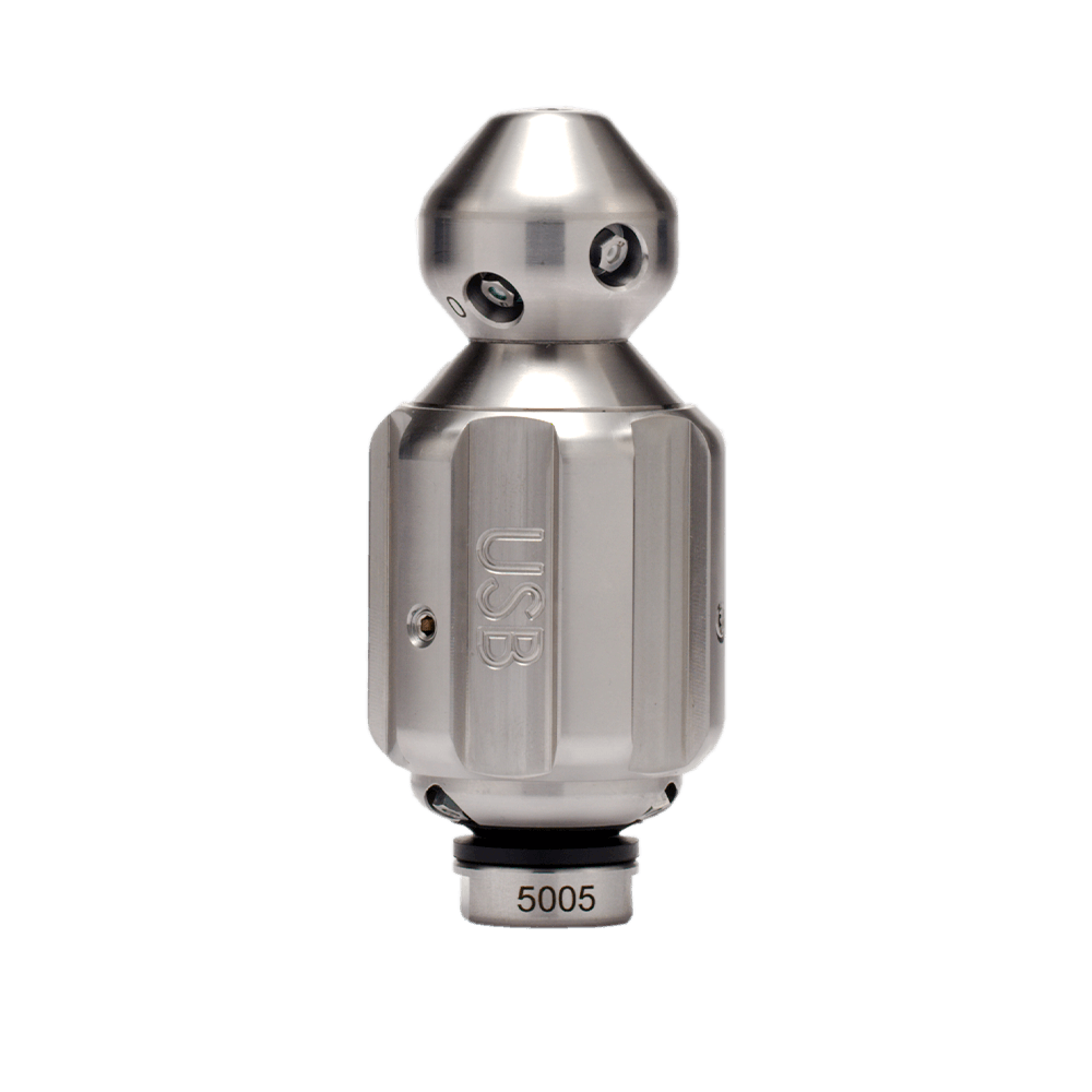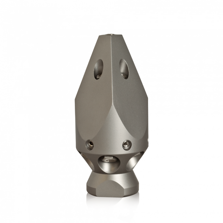 Radial- Reinigungsdüse aus gehärtetem Edelstahl für streifenfreie und überdeckende Rundumreinigung, zum Einsatz vor der Kamerabefahrung.
