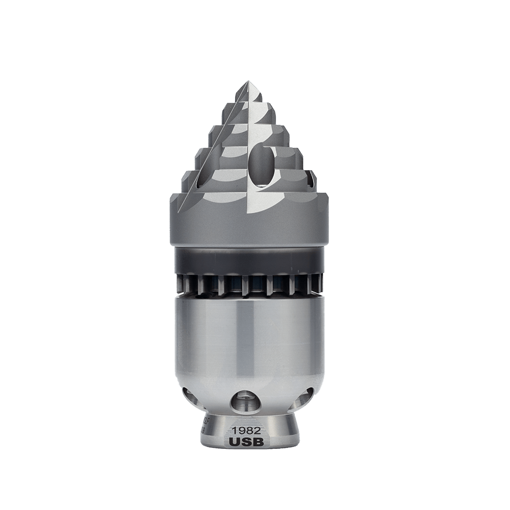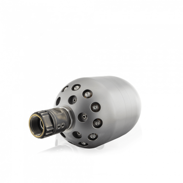 Rotordüse mit feststehendem Vorstrahl und im Rotor angebrachten Düsen (15° zur Wandung). Ermöglicht Transport von abgetragenem Material, Schlamm oder Sand nach vorne bei gleichzeitiger, gründlicher Reinigung.